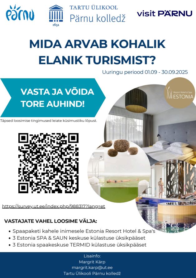 Turismiarenduse eestvedajad Visit Pärnu meeskonnas soovivad teada saada, mida kohalikud elanikud arvavad turismist ning kuidas nad on rahul turismiarendusega oma kodukohas. Küsimustik on anonüümne ja selle täitmine võtab aega umbes 5-12 minutit. Kõigi vastanute vahel, kes soovivad osaleda loosimises ja jätavad küsimustiku lõpus oma telefoninumbri, loositakse välja mõnusaid spaaelamusi. Loosirattas keerlevad üks spaapakett kahele inimesele Estonia Resort Hotel & Spa’s (majutus, buffee hommikusöök, spaa- ja saunakeskuse külastus), 3 Estonia SPA & SAUN keskuse ning 3 Estonia spaakeskuse TERMID külastuse üksikpääset. Loosimine toimub pärast uuringuperioodi lõppemist. Võitjatega võtab telefoni teel ühendust Visit Pärnu esindaja.