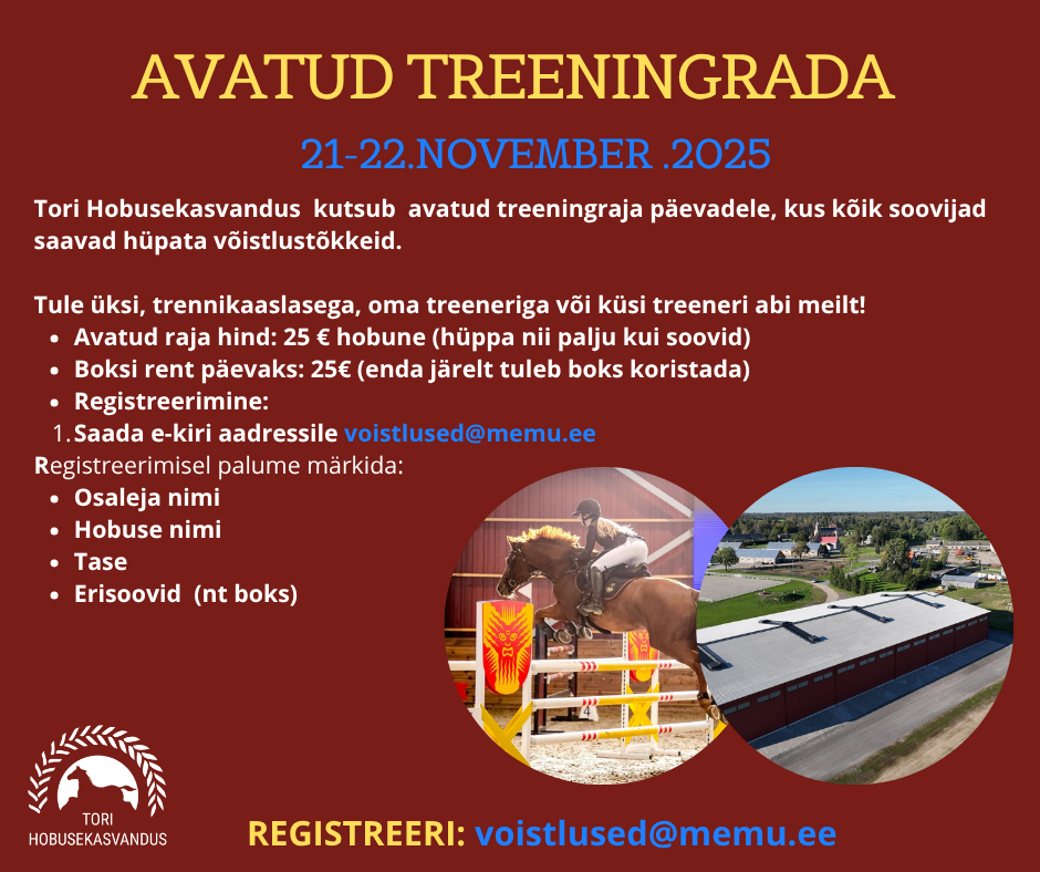 Tori hobusekasvandus kutsub 21.-22. novembril avatud treeningraja päevadele, kus kõik soovijad saavad hüpata võistlustõkkeid. Tule üksi, trennikaaslasega, oma treeneriga või küsi treeneri abi hobuskasvandusest!